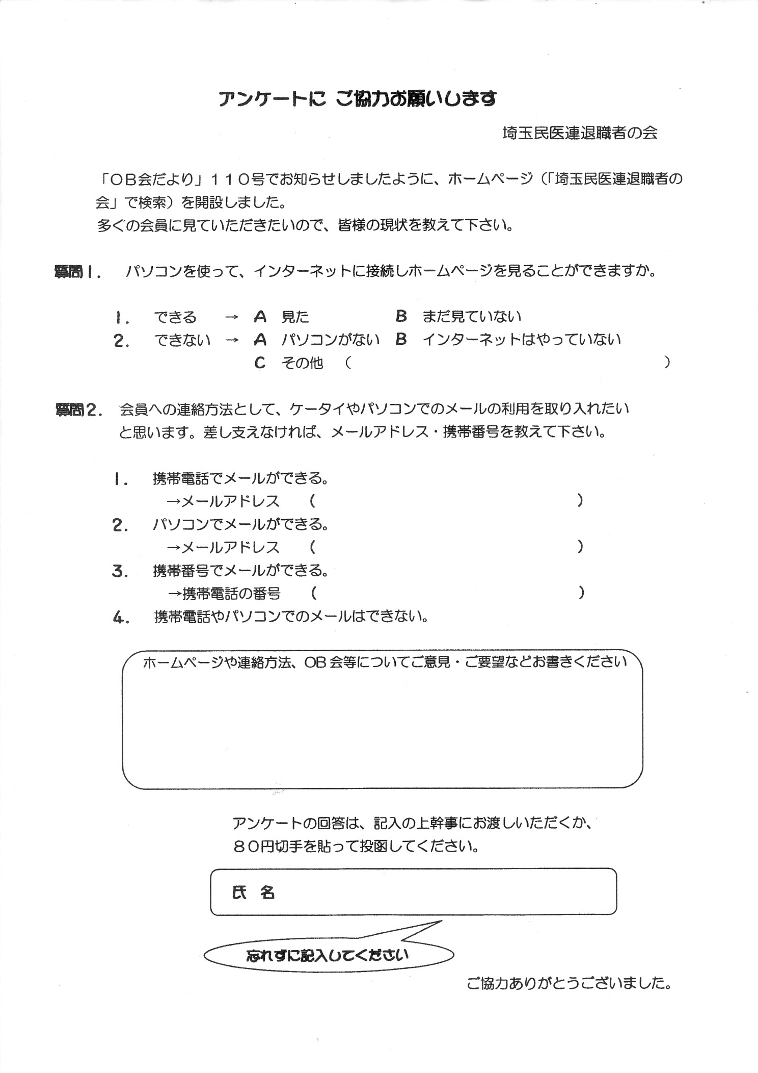 「OB会だより」111号に2枚のアンケート用紙を同封致しました。1枚目は埼玉